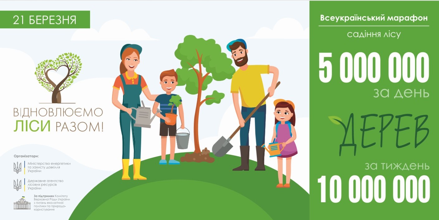У Міжнародний день лісів, 21 березня, в Україні буде висаджено 5 мільйонів дерев, а за тиждень, 21 – 29 березня, — щонайменше 10 мільйонів. Нову всеукраїнську акцію «Відновлюємо ліси разом» започатковує Міністерство енергетики та захисту довкілля спільно з Державним агентством лісових ресурсів.