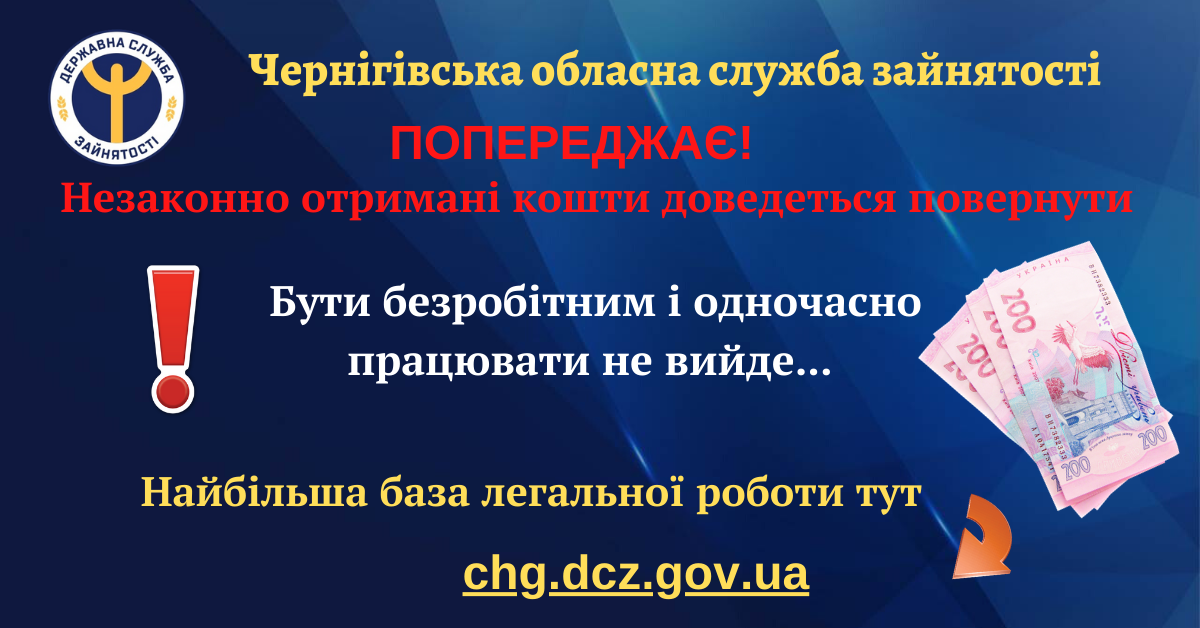 За словами начальника юридичного відділу Чернігівського обласного центру зайнятості Марини Чаус, якщо виявиться, що особа, зареєстрована як безробітна, працює та отримує дохід, з неї буде стягнуто незаконно отримані кошти та, можливо, застосовані штрафні санкції. Протягом I півріччя 2020 року в Чернігівській області виявлено 42 особи, які неправомірно отримали кошти Фонду загальнообов’язкового державного соціального страхування України на випадок безробіття майже на 165 тисяч гривень. Добровільно вони відшкодували понад 109 тисяч. До суду поданий один позов на суму близько 28 тисяч гривень. Решта відшкодовувань у процесі повернення.
