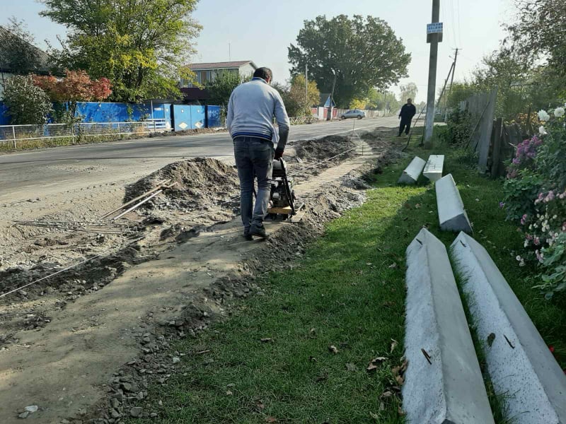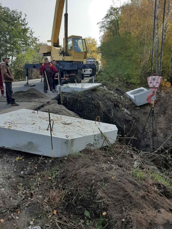 Зараз тривають роботи з укріплення укосів бетонними плитами, установка оголовків труб, влаштування бетонних основ під бортовий камінь.